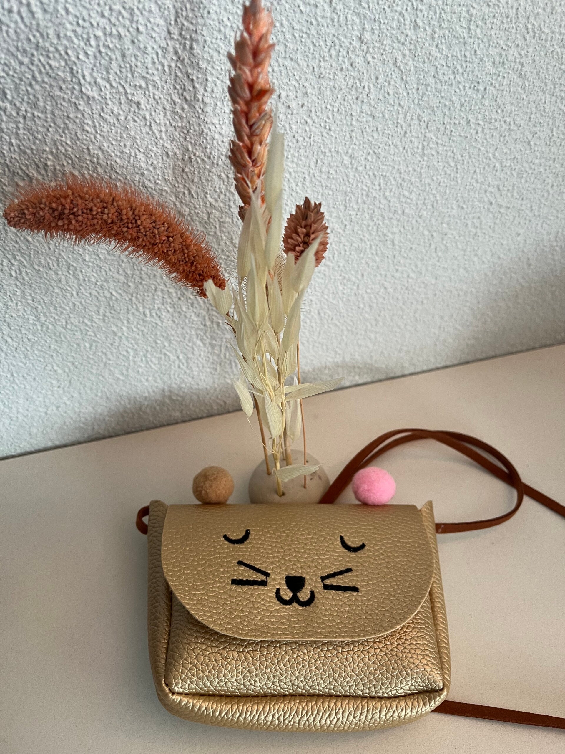 Het tasje is voor zien van een klitterbandje en een koort om omhangen van lederen.