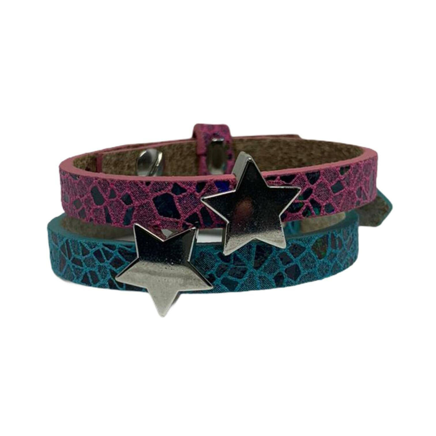 Stoere lederen armbandjes in het rosé en blauwe holagraphic.